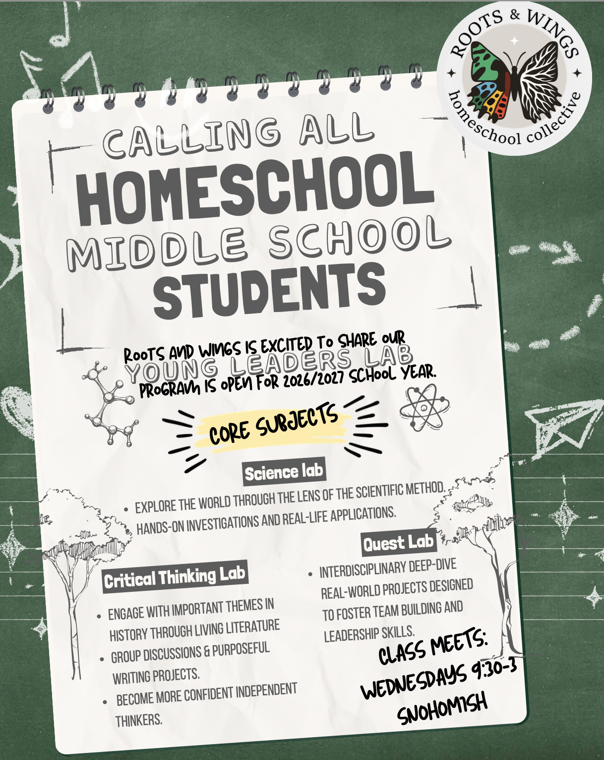 Once a month field trips will be coordinated with Roots and Wings co-op on Fridays geared towards middle schoolers. These are optional but encouraged to build friendships and community.